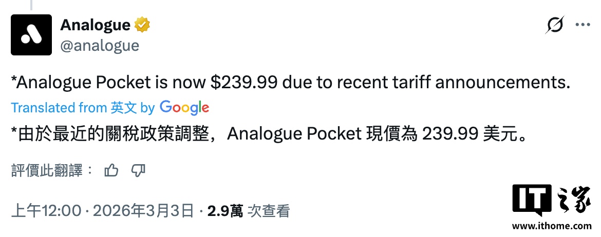 作为参考,Analogue Pocket 掌机最初公布于 2019 年 10 月,最初定价 199 美元(现汇率约合 1374 元人民币),但在 2021 年 12 月开启预购时涨价成 219 美元(现汇率约合 1512 元人民币)。